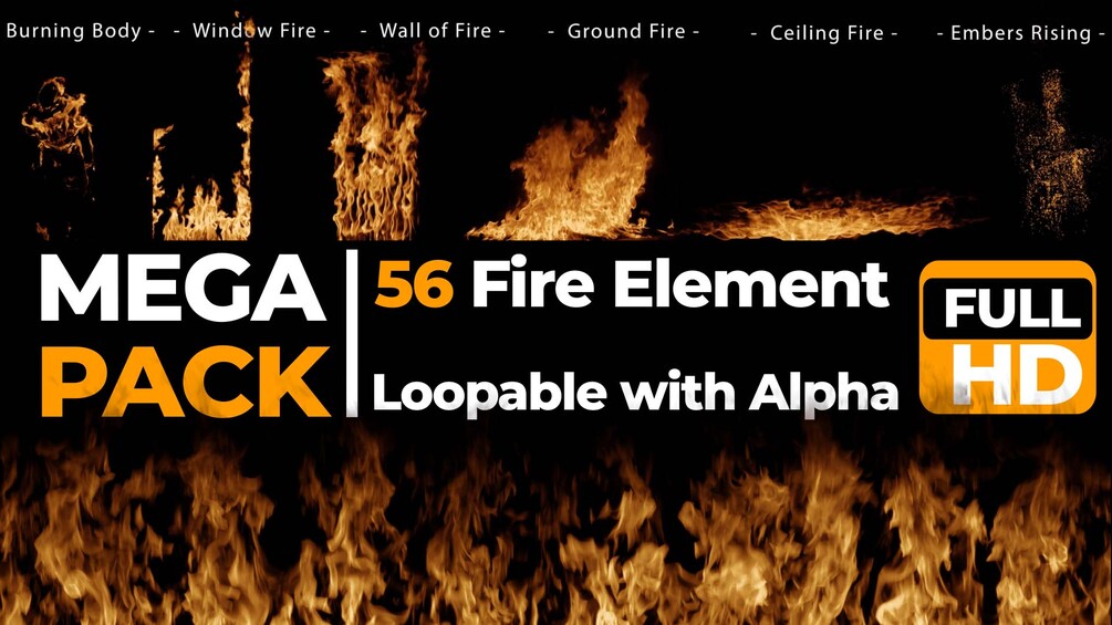 This Mega pack include 56 Clips with Burning Body, Ground Fire ,Wall Fire, Ceiling Fire, WindowFire and EmbersRising Large scale and alpha channel. Front and high angle view. Easy to use, just place the clip over your footage. Ideal for visual effects and motion graphics